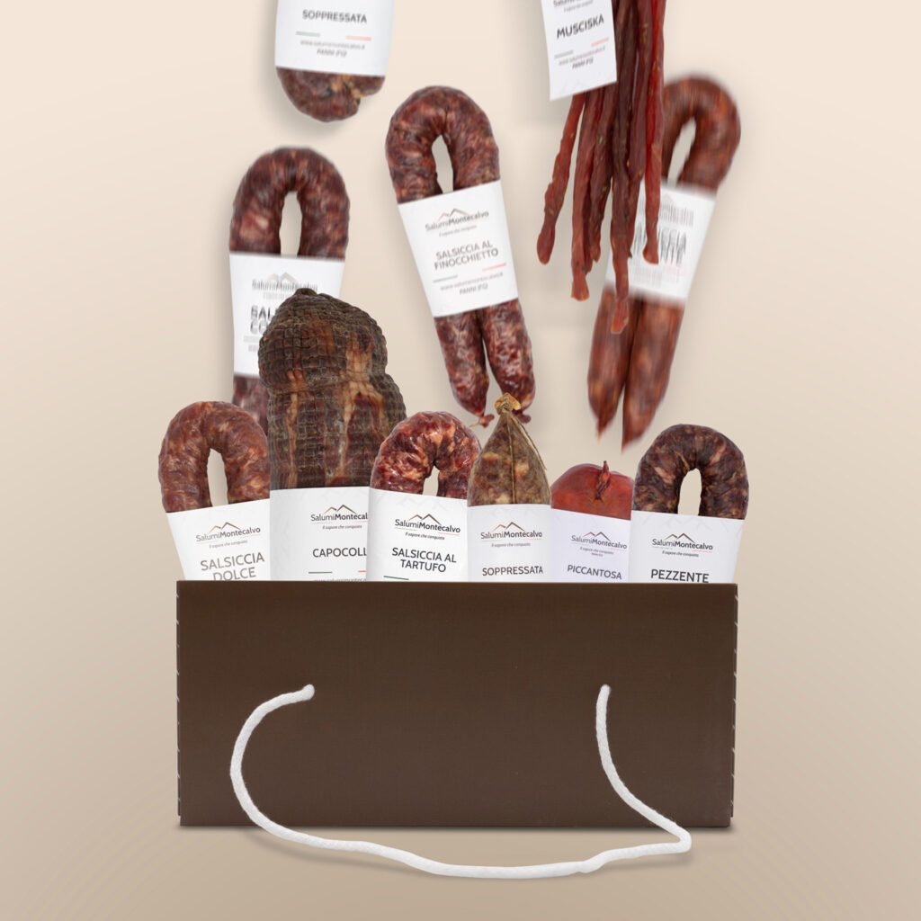 Here, far from the chaos and smog of big cities, we enjoy fresh air thanks to our altitude and the abundance of surrounding woods. This enables us to naturally age our cured meats in our caves, benefiting from a unique microclimate. The uniqueness of our products is also enriched by the blend of cultures as we are situated on the border with Campania.
